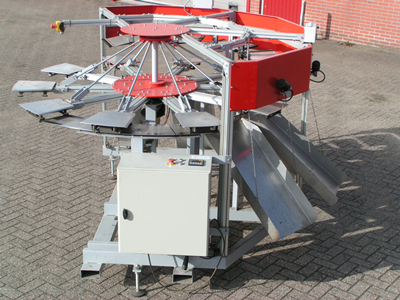 Het product wordt op de vooringestelde uitgang, d.m.v. een mechanisch afschuiver, van de oplegplaat geschoven, waarna het via een glijgoot in het onderstaande fust wordt gevoerd.